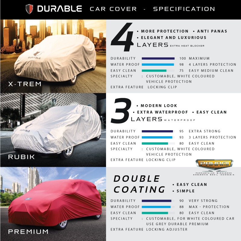 Durable Premium Car Cover merupakan sebuah produk unggulan dari Durable Indonesia karena kekuatannya untuk melindungi mobil dari terik matahari, air hujan, dan debu.